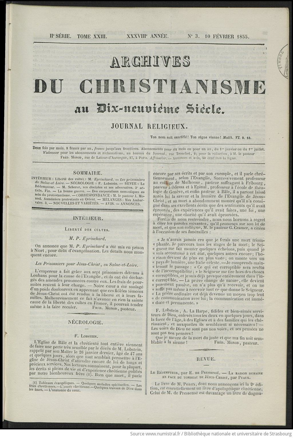 Archives Du Christianisme Au Xixe Siecle 1855 02 10 Numistral De Lapologetique Chretienne Au Xixe Siecle French Edition