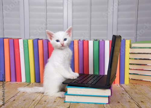 Fluffy White Kitten Sitting On A Wood Table Looking At Viewer Paw Kitten Can A Concept Book stock.adobe.com