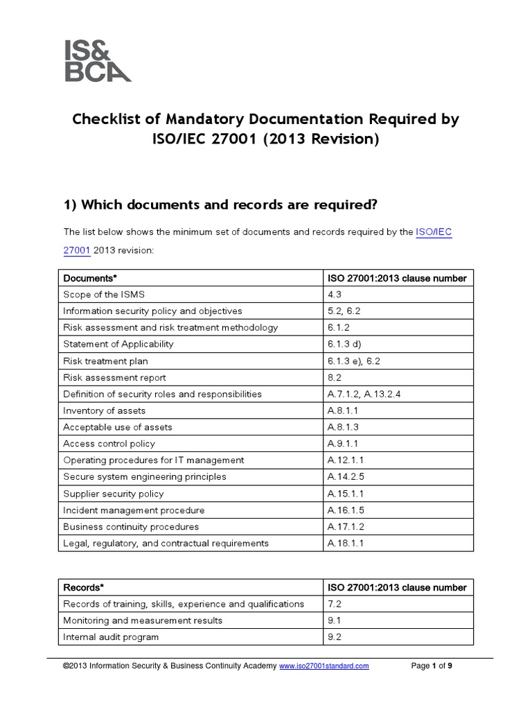 Checklist Of Mandatory Documentation Required By Iso 27001 2013 Security Risk Assessment Checklist Template